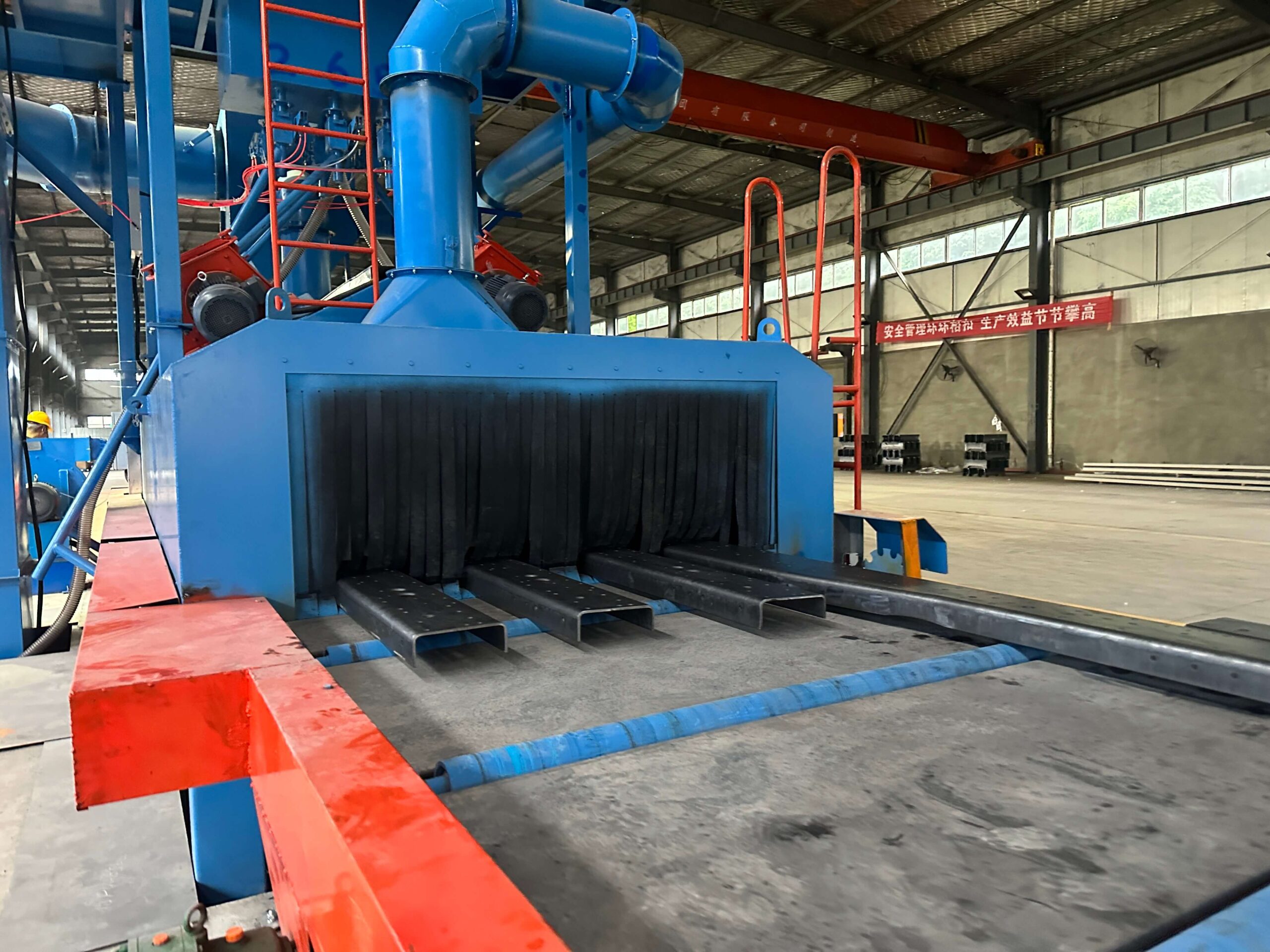 With automatic self-feeding of workpieces, it meets the requirements of production lines.It is applied to industries such as shipbuilding, automobiles,motorcycles, bridges, and machinery manufacturing.It is mainly used for stress relief and surface rust removal of large steel structures, H-beams, and similar components.